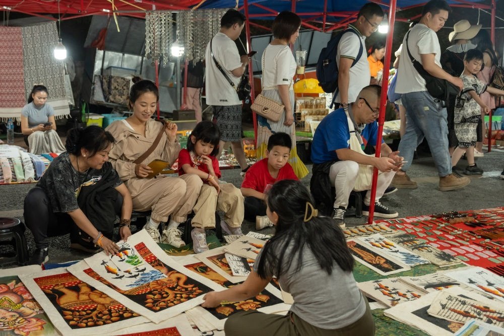 2月16日,游客在老撾瑯勃拉邦夜市上購買當(dāng)?shù)貍鹘y(tǒng)手工藝品。