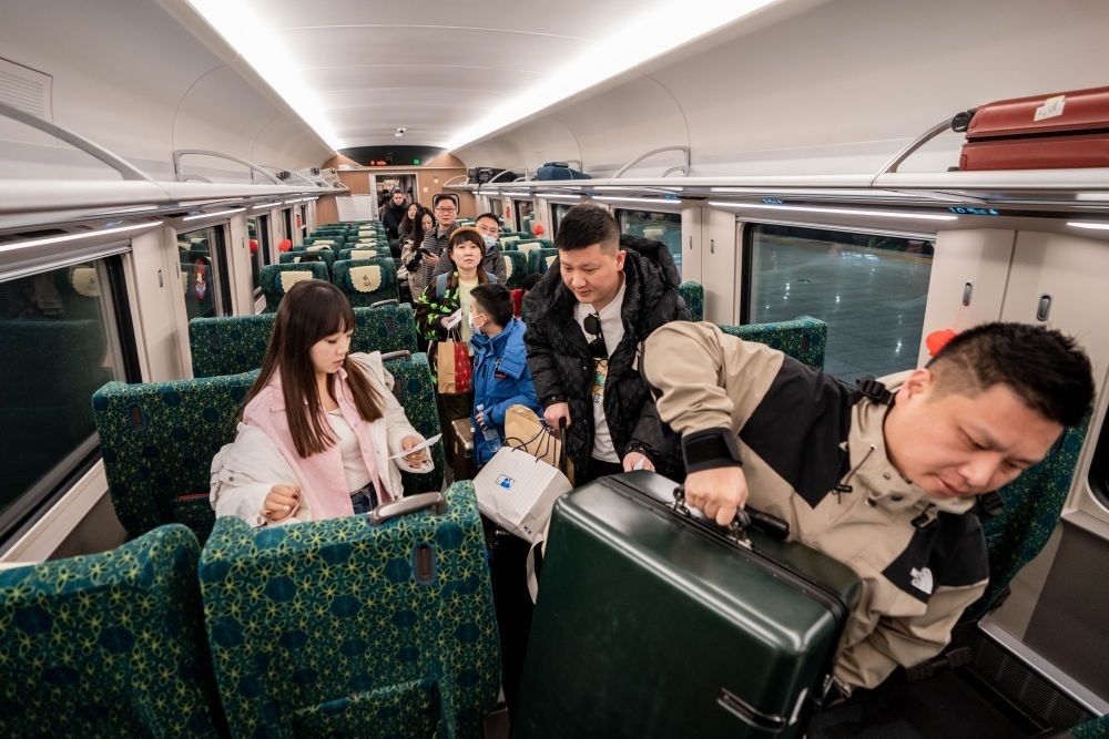 2月14日,游客在昆明南站乘坐中老鐵路國際旅客列車準(zhǔn)備前往老撾旅游。