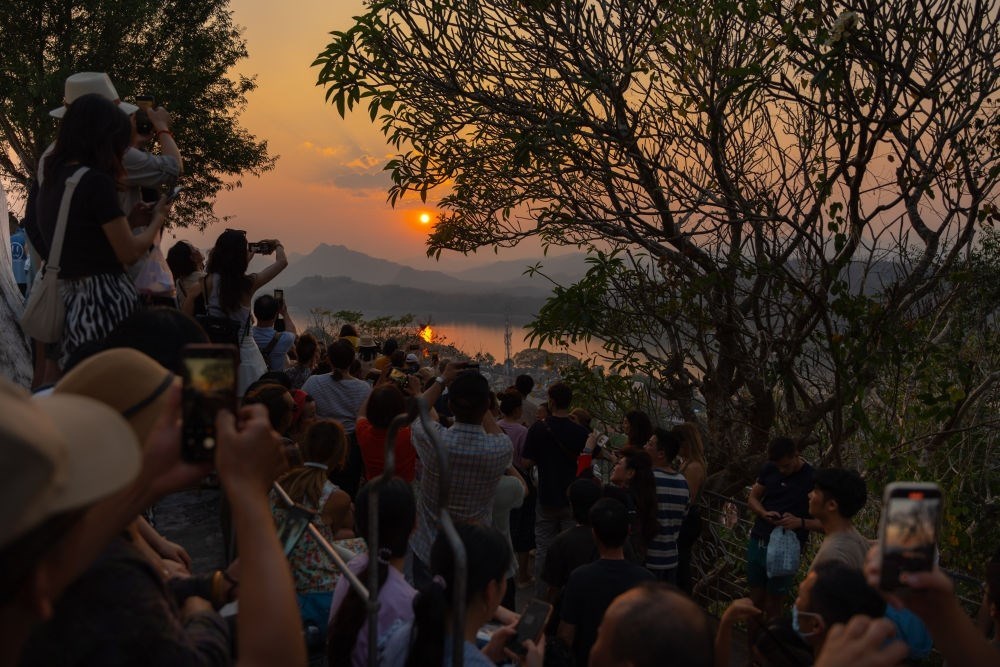 2月16日,在老撾瑯勃拉邦普西山山頂,游客在觀賞落日景觀。湄公河畔、老撾北部群山環(huán)繞的瑯勃拉邦在14到16世紀(jì)間曾是老撾歷史上第一個(gè)統(tǒng)一的多民族國家瀾滄王國的首都?,槻罟懦?995年被聯(lián)合國教科文組織列入世界文化遺產(chǎn),如今已經(jīng)成為老撾歷史與文化的象征。