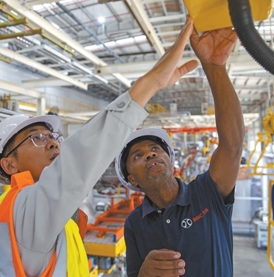 中國(guó)和南非兩國(guó)員工在南非東開(kāi)普省北汽南非工廠(chǎng)焊裝車(chē)間內(nèi)工作。新華社記者 張譽(yù)東攝