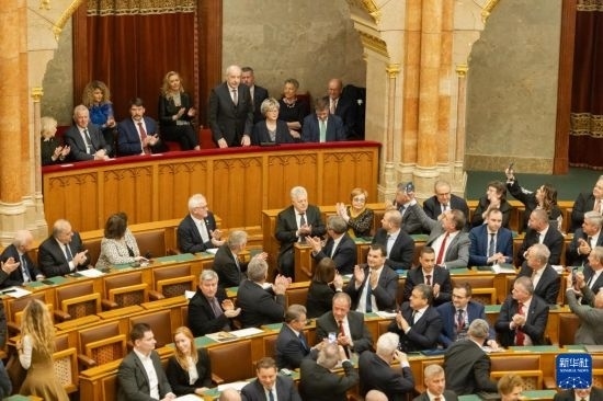 2月26日,在匈牙利布達(dá)佩斯,匈牙利當(dāng)選總統(tǒng)舒尤克·道馬什(后中)接受祝賀。新華社發(fā)(弗爾季·奧蒂洛攝)