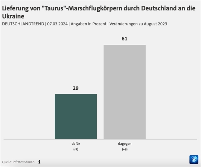 根據(jù)德國(guó)電視一臺(tái)當(dāng)?shù)貢r(shí)間7日公布的最新“德國(guó)趨勢(shì)”民調(diào),在“竊聽(tīng)門(mén)”事件發(fā)生后,61%的德國(guó)民眾反對(duì)向?yàn)蹩颂m提供“金牛座”巡航導(dǎo)彈,較去年8月的民調(diào)結(jié)果增長(zhǎng)了9%;支持的民眾數(shù)量減少了7%,占比僅為29%。民調(diào)還顯示,70%的受訪者擔(dān)心間諜活動(dòng)增加,67%的人擔(dān)心德國(guó)對(duì)此缺乏準(zhǔn)備,還有62%的民眾擔(dān)心德國(guó)可能會(huì)直接卷入戰(zhàn)爭(zhēng)。