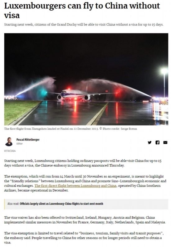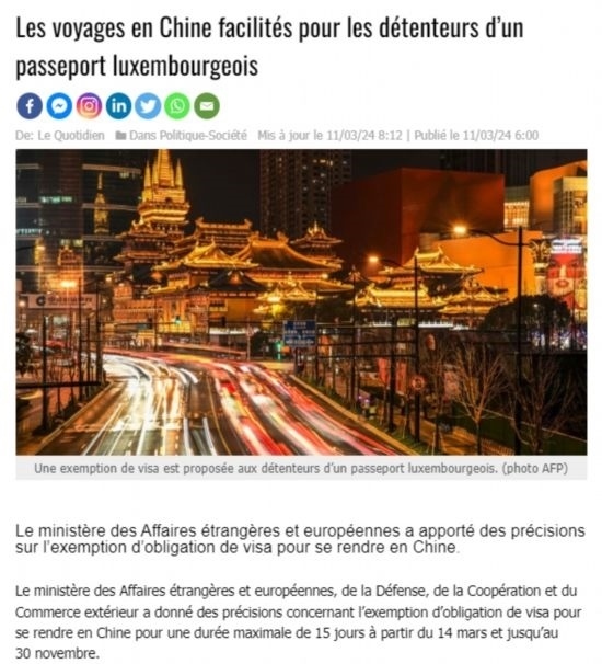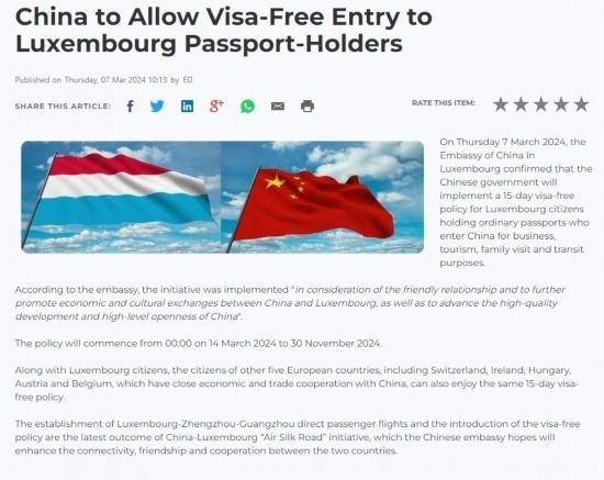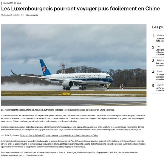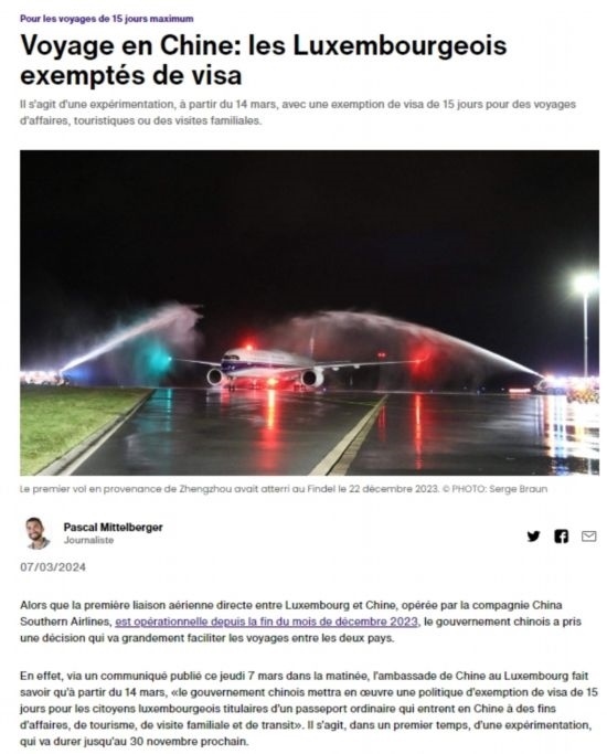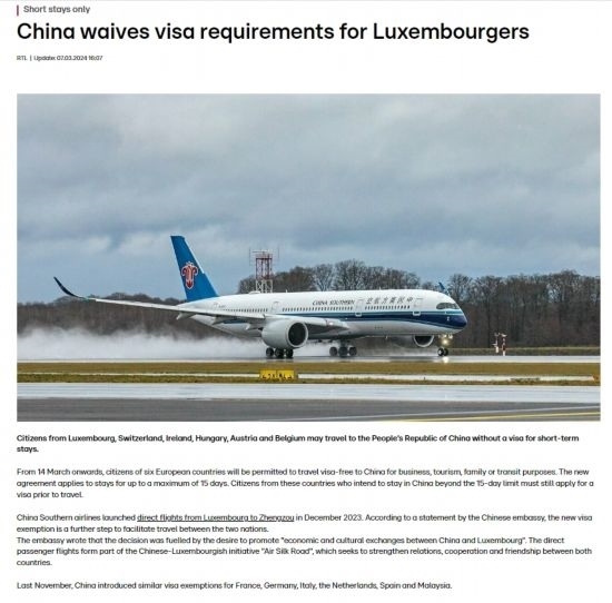 近日,中國政府決定自2024年3月14日0時起至2024年11月30日24時,對包括盧森堡在內(nèi)的6國持普通護(hù)照人員實(shí)行部分免簽。中國駐盧使館及時向盧外交部等部門和主流媒體作了通報(bào),盧政府和媒體對中方免簽政策予以高度評價(jià)。