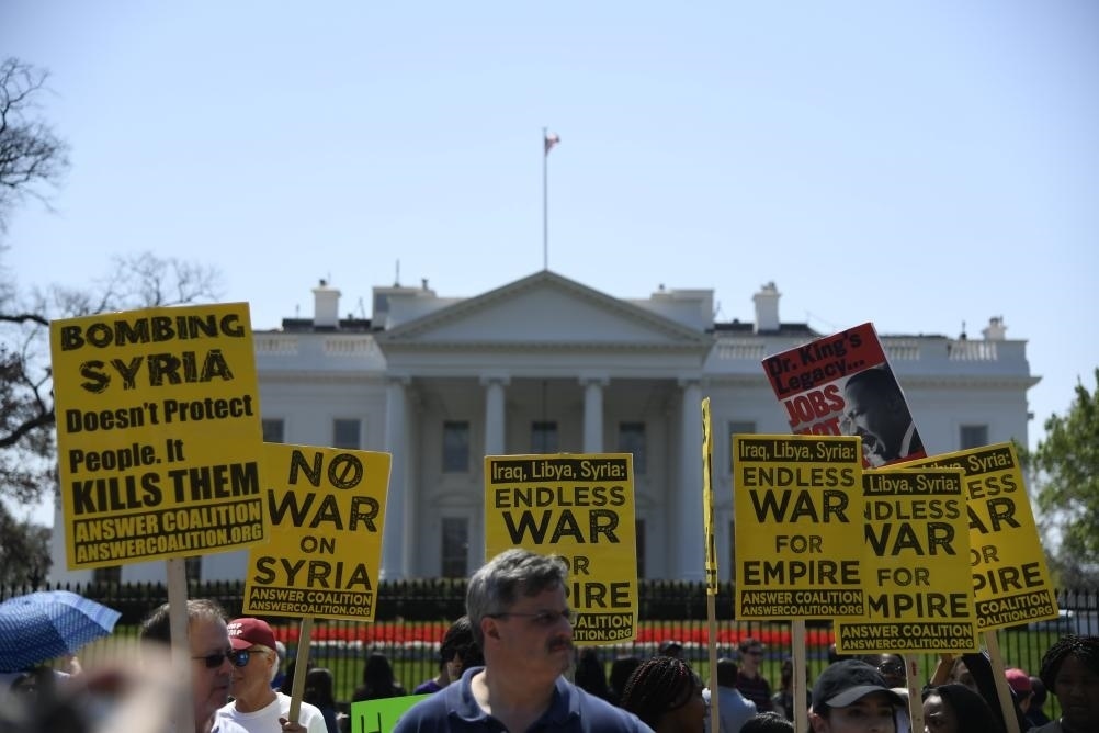 2018年4月14日,在美國(guó)華盛頓白宮北側(cè),人們手持標(biāo)語抗議對(duì)敘利亞進(jìn)行軍事打擊。新華社記者楊承霖?cái)z