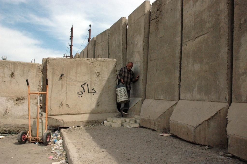 ?2013年3月20日,在伊拉克首都巴格達(dá),一名伊拉克人從防爆墻的縫隙之間穿過。新華社發(fā)(巴沙爾攝)