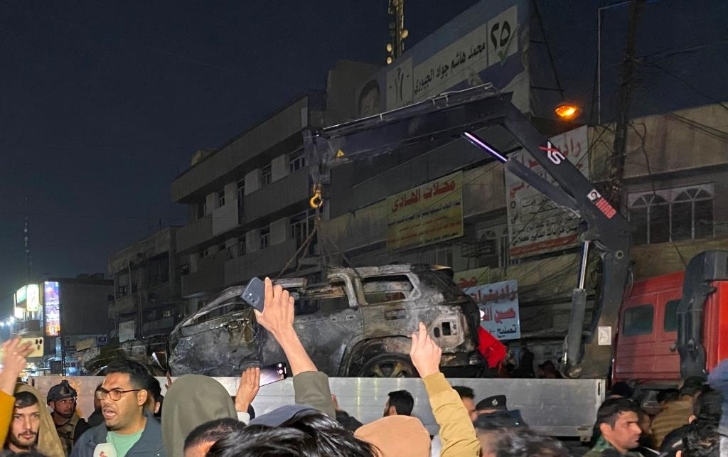 ?2024年2月7日,在伊拉克首都巴格達(dá),民防部門轉(zhuǎn)移遭無人機(jī)襲擊的車輛。新華社發(fā)(哈利勒·達(dá)伍德攝)