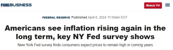 ??怂股虡I(yè)頻道在其另一篇報道中提到,據(jù)8日公布的一項紐約聯(lián)邦儲備銀行(Federal Reserve Bank of New York)進行的消費者預期調查顯示,美國人正在為未來幾年的高通脹率做準備,公眾普遍的預期中值為從現(xiàn)在起一年內通脹率將上升3%,與前幾個月持平,并在未來幾年通脹將保持高位,這表明他們認為粘性通脹恐會持續(xù)下去。