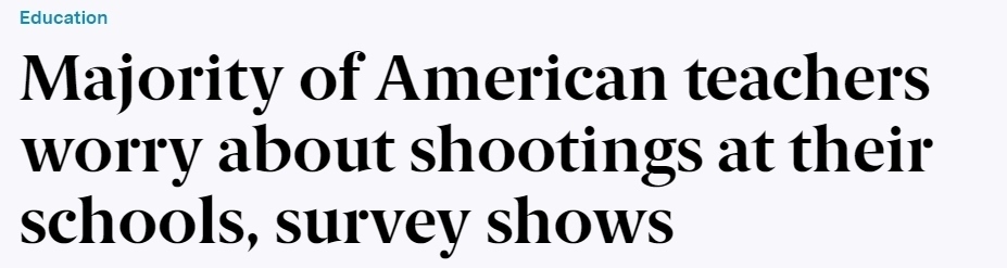 報(bào)道稱,2023年,美國(guó)發(fā)生的校園槍擊事件數(shù)量達(dá)到了歷史新高。在接受皮尤調(diào)查的受訪者中,59%的人對(duì)校園槍擊表示擔(dān)心,其中18%的人說(shuō)自己對(duì)此感到“非?!被蛘摺皹O度”擔(dān)心。只有7%的受訪教師稱,他們完全不擔(dān)心校園槍擊的發(fā)生。