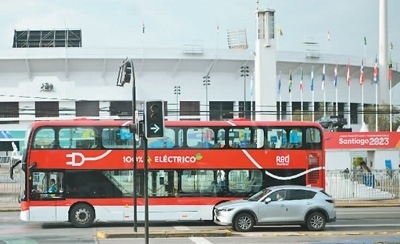 在智利首都圣地亞哥,一輛520路新能源公交車(chē)經(jīng)過(guò)2023泛美運(yùn)動(dòng)會(huì)主場(chǎng)館。新華社記者 辛悅衛(wèi)攝