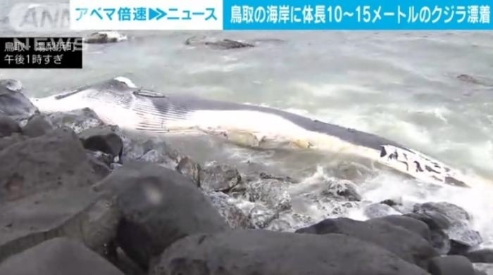 鳥取縣有關(guān)部門判斷這條鯨魚為塞鯨或布氏鯨,推斷已死亡很長(zhǎng)時(shí)間,尸體表面已經(jīng)開始腐爛變色,當(dāng)?shù)卣趯?duì)處理方法進(jìn)行商討。