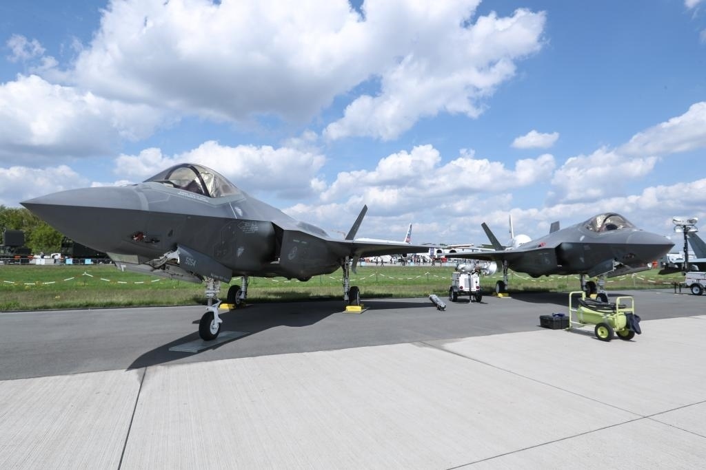 ?這是2018年4月27日在德國柏林國際航空航天展上拍攝的“F-35”型戰(zhàn)機(jī)。新華社記者單宇琦攝