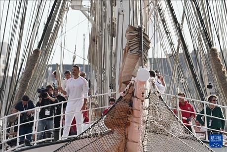 傍晚時(shí)分,伴隨著現(xiàn)場(chǎng)觀眾高唱法國(guó)國(guó)歌《馬賽曲》,“貝勒姆”號(hào)緩緩駛進(jìn)港口,著名的“法蘭西巡邏兵”飛行表演隊(duì)從港口上空呼嘯而過(guò),先后展示了奧運(yùn)五環(huán)與法國(guó)國(guó)旗的圖案。