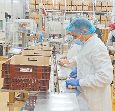 法國(guó)薩高公司香腸包裝車(chē)間內(nèi),工人們正在包裝香腸。本報(bào)記者 邢 雪攝