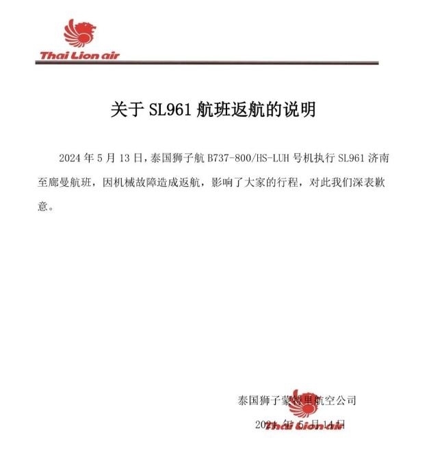 央視網(wǎng)消息:據(jù)泰國獅航公眾號(hào)消息,5月15日泰國獅航發(fā)布關(guān)于SL961航班返航的說明,2024年5月13日,泰國獅航B737-800/HS-LUH號(hào)機(jī)執(zhí)行SL961濟(jì)南至曼谷廊曼航班,因機(jī)械故障造成返航。該航司對此致歉。