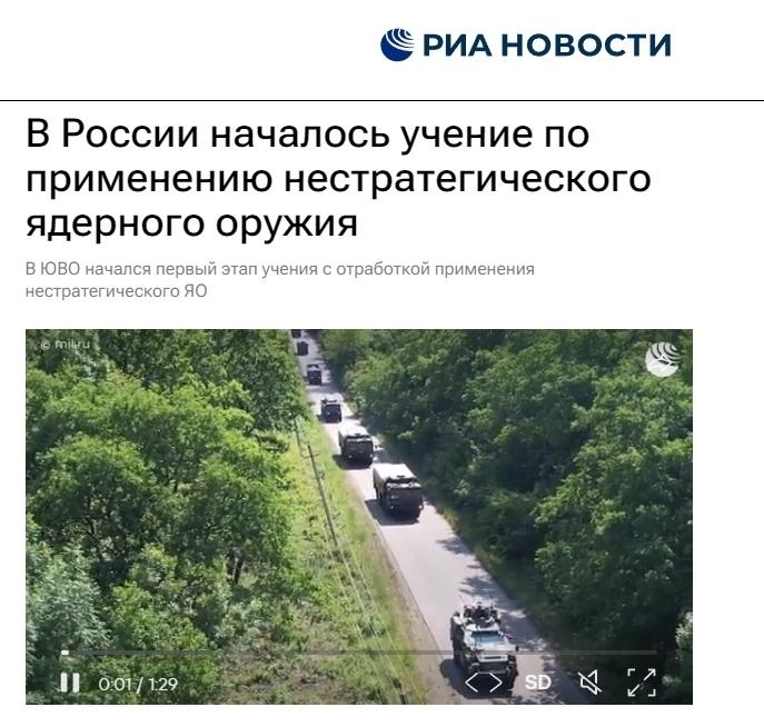 中新網(wǎng)5月22日電 綜合俄媒報(bào)道,俄國(guó)防部當(dāng)?shù)貢r(shí)間21日表示,俄羅斯已開(kāi)始第一階段的非戰(zhàn)略核力量演習(xí),就準(zhǔn)備使用非戰(zhàn)略核武器進(jìn)行實(shí)際演練。