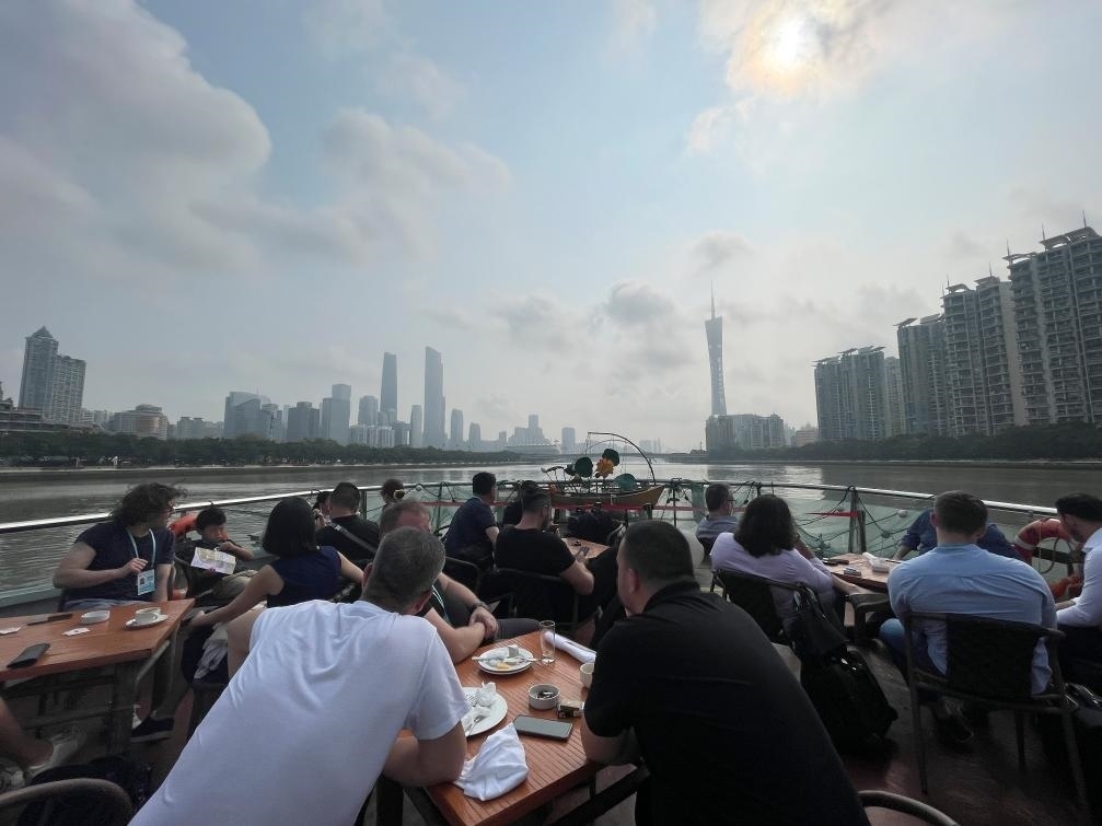 4月15日,采購(gòu)商從入住的白天鵝賓館乘坐定制接駁交通船前往第135屆廣交會(huì)場(chǎng)館。新華社記者霍思穎攝