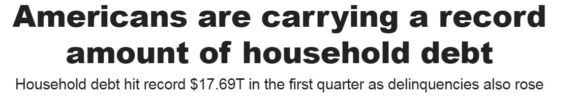 美國紐約聯(lián)邦儲(chǔ)備銀行公布的最新數(shù)據(jù)顯示,今年一季度,美國家庭債務(wù)總額達(dá)到17.69萬億美元(約合人民幣128萬億元),創(chuàng)下歷史新高。