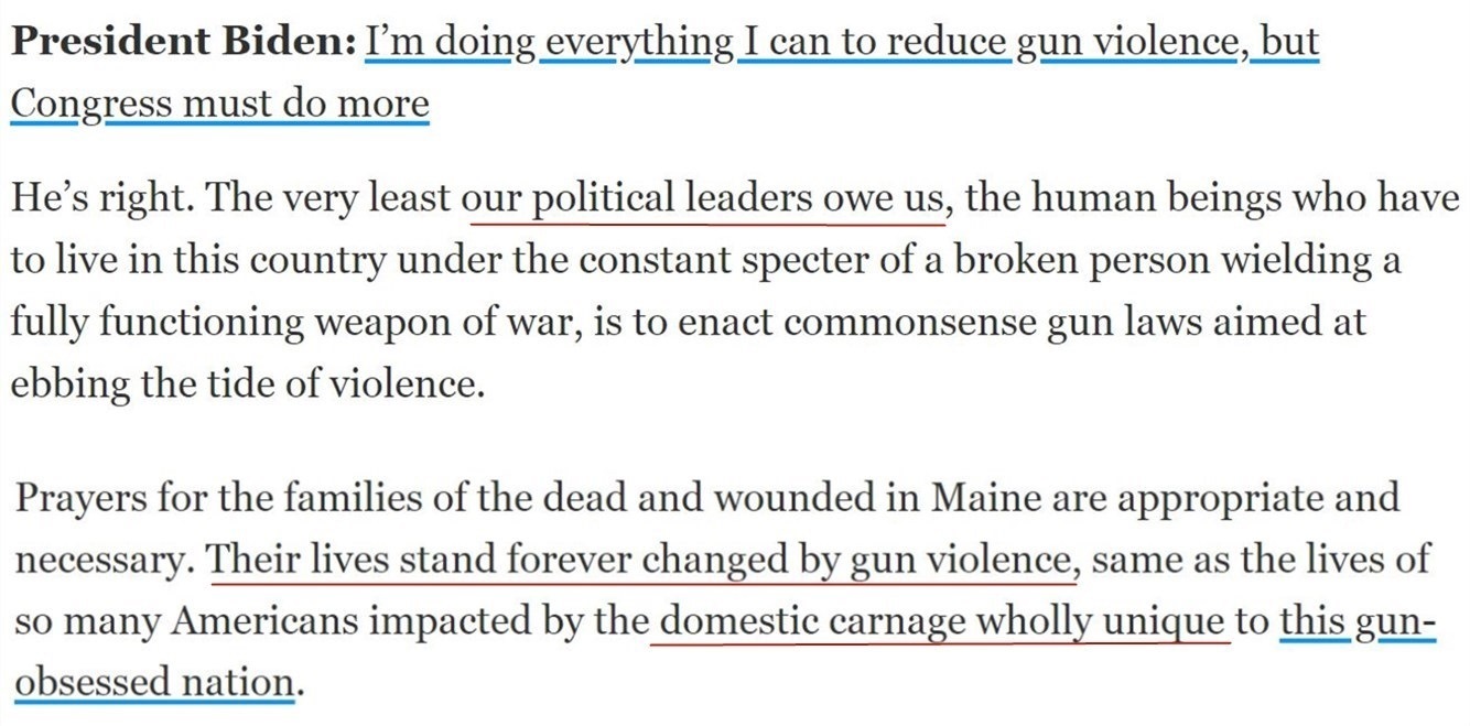 《今日美國報》曾評論說,美國至今沒有一部能夠遏制槍支暴力的有效控槍法案,“這是我們的政治領(lǐng)導(dǎo)人欠我們的”。
