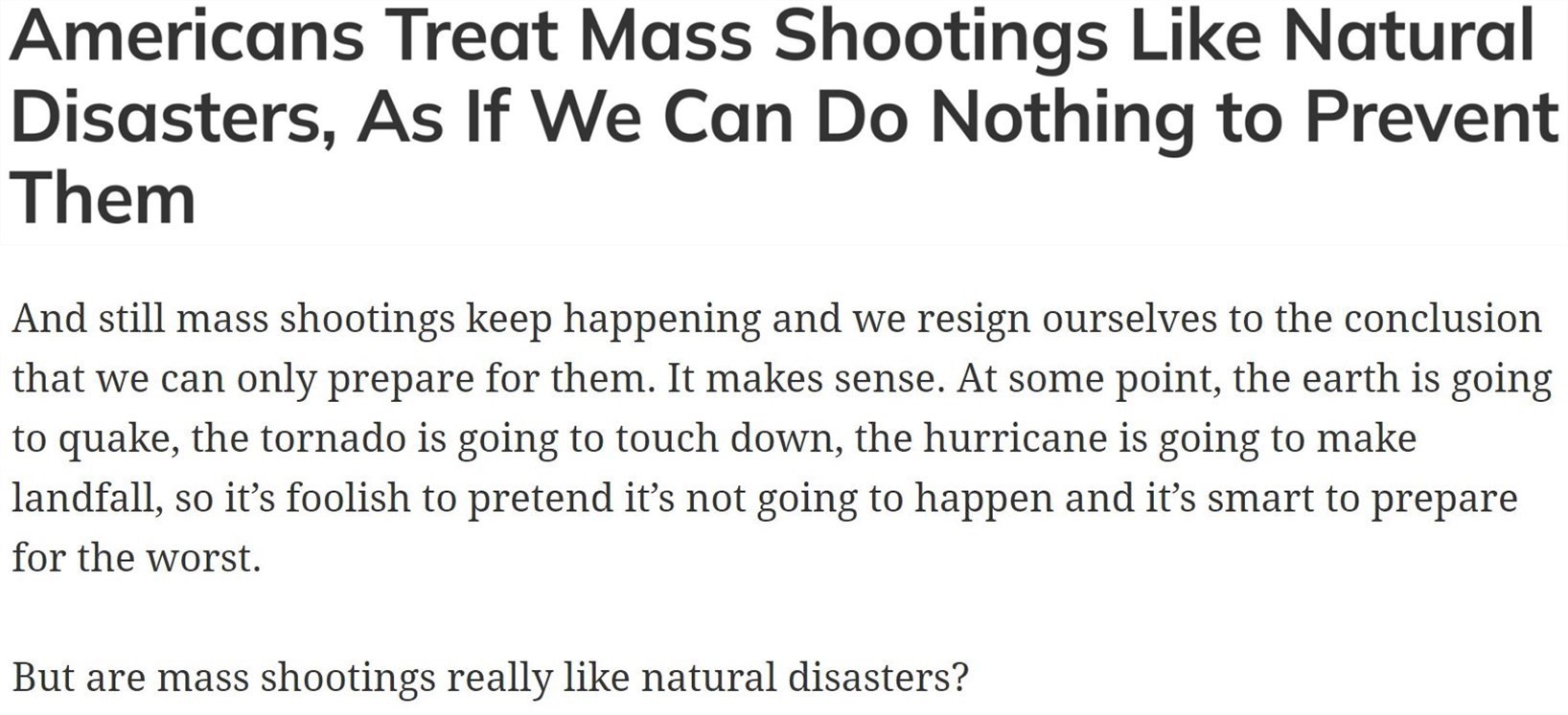 有美媒稱,對于一起又一起槍擊事件,如今的美國只是進(jìn)行數(shù)字的統(tǒng)計,卻無力采取行動改變現(xiàn)狀,似乎在美國人眼里,槍支暴力已經(jīng)成為像洪水、颶風(fēng)、野火一樣的“天災(zāi)”,而不是可以預(yù)防的人禍。