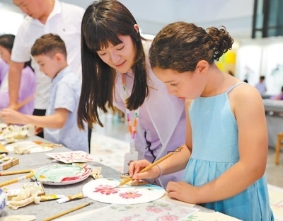 活動現(xiàn)場,一名外國小朋友在老師的指導(dǎo)下,正在中國傳統(tǒng)扇面上繪制花朵圖案。本報記者 崔 琦攝