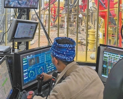 通過參與艾伯特湖區(qū)油田建設(shè),東方宏華還研發(fā)出“一鍵聯(lián)動”舉升式排管系統(tǒng),以舉升移運(yùn)、多系統(tǒng)協(xié)同、離線作業(yè)、智能感知、一鍵集控五大技術(shù)為核心,實(shí)現(xiàn)在地面、臺面和高空三大區(qū)域的自動化作業(yè)?!坝辛宋覀冏灾餮邪l(fā)的智能系統(tǒng)加持,操作人員只需點(diǎn)擊屏幕,就可以完成接立柱和鉆井等操作?!睎|方宏華所屬宏華電氣副總經(jīng)理汪虹宇介紹。