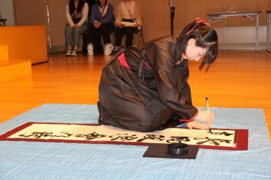 6月15日,在日本東京,選手在“漢語(yǔ)橋”世界中學(xué)生中文比賽日本賽區(qū)決賽中展示中文書法。記者 胡曉格 攝