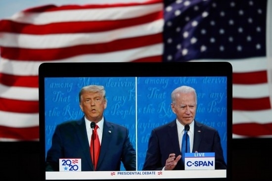 這張2020年10月22日在美國弗吉尼亞州阿靈頓拍攝的視頻畫面顯示,時(shí)任美國總統(tǒng)特朗普(左)與民主黨總統(tǒng)候選人拜登在田納西州納什維爾市參加最后一場總統(tǒng)候選人電視辯論。新華社記者劉杰攝