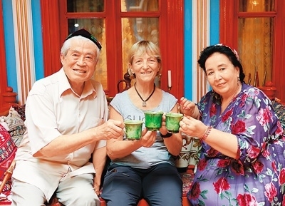 9月8日是維娜從家鄉(xiāng)意大利威尼斯出發(fā)的第846天。當(dāng)天,在新疆烏魯木齊市亞歐風(fēng)情街上的高加索餐廳,維娜度過(guò)了自己的75歲生日。熱情洋溢的新疆歌舞、琳瑯滿目的美食佳肴、真摯友愛的生日祝福……別開生面的生日慶?;顒?dòng)讓維娜深受感染。身披新疆特色的絲綢圍巾,她被載歌載舞的維吾爾族姑娘簇?fù)碇?,在手風(fēng)琴聲中翩翩起舞。很難想象,舞池中滿面春風(fēng)的她,曾獨(dú)自穿梭于中亞廣袤無(wú)垠的沙漠綠洲,也一人攀越過(guò)帕米爾高原的崇山峻嶺。