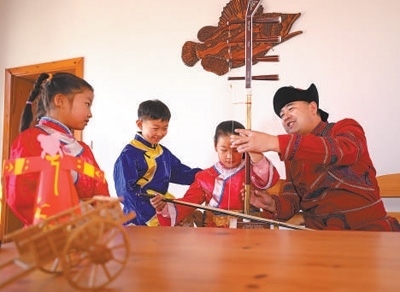 哈拉新村村民在教當?shù)睾⒆友葑鄠鹘y(tǒng)樂器。齊齊哈爾大學(xué)孟加拉國籍留學(xué)生 衣睿實攝“在哈拉新村,我看到四弦琴造型的村口大門、魚叉狀的路燈,還有整整齊齊的‘介字房’……這里獨特的民族文化、濃郁的鄉(xiāng)土風(fēng)情,給我留下了深刻印象。當?shù)丶缺A魝鹘y(tǒng)的達斡爾族人文特征,又開發(fā)文化體驗館、民族特色美食等現(xiàn)代旅游資源,重視文化保護和傳承的做法值得借鑒?!?/p>