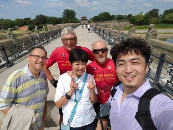 菲奧林與法基內(nèi)蒂的紅色騎行T恤上,用意大利語(yǔ)印著“Marco Polo a Pedali”,意為“自行車(chē)上的馬可·波羅”?!拔覀兿胫刈唏R可·波羅之路,向這位偉大的威尼斯旅行家致敬?!狈茒W林接受新華社記者采訪(fǎng)時(shí)說(shuō),“馬可·波羅旅行非常緩慢,步行、騎馬,甚至乘船。我們也想用一種非常慢的交通方式,可以看到經(jīng)過(guò)的風(fēng)景,一米一米地征服道路,沿途風(fēng)光將不可磨滅地留在眼里、心中。”