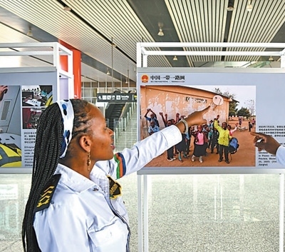 3月22日,在肯尼亞首都內(nèi)羅畢,當(dāng)?shù)厝嗽诿蓛?nèi)鐵路內(nèi)羅畢火車站參觀中非共建“一帶一路”務(wù)實(shí)合作圖片展。新華社記者 韓 旭攝
