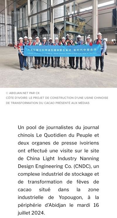 7月16日,人民日?qǐng)?bào)與兩家科特迪瓦新聞機(jī)構(gòu)記者一行參觀了由中國輕工業(yè)南寧設(shè)計(jì)工程有限公司總承包的可可加工及可可豆倉庫建設(shè)項(xiàng)目,該項(xiàng)目坐落在阿比讓郊區(qū)的約普貢工業(yè)區(qū)。該公司負(fù)責(zé)人指出,該項(xiàng)目綜合體計(jì)劃于2024年年底完工,包括一個(gè)可加工5萬噸可可豆的工廠、可存儲(chǔ)14萬噸可可豆的倉庫以及培訓(xùn)中心、行政大樓等。——摘自科特迪瓦阿比讓網(wǎng)報(bào)道
