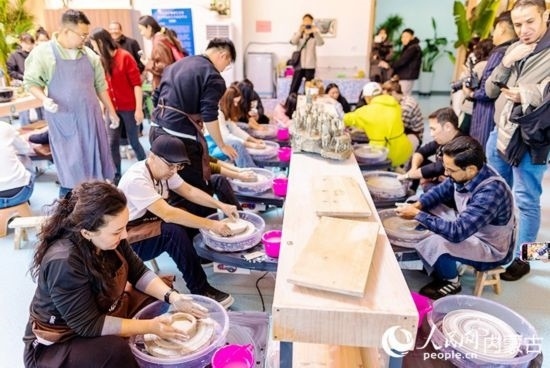 外媒記者進行泥塑體驗。人民網(wǎng)記者 張雪冬攝