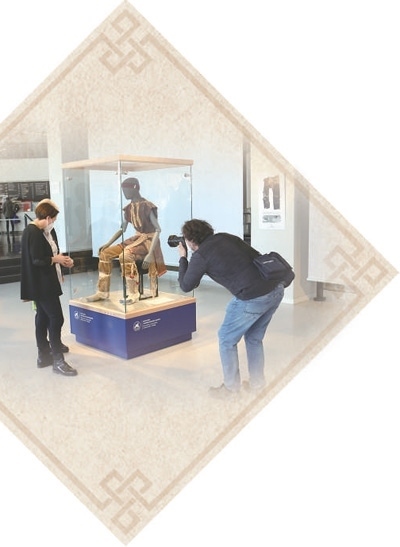 加入科研團(tuán)隊(duì)的德國服裝設(shè)計(jì)師卡特琳·迪爾斯娜第一次接觸古代服飾文物,但多年來為歷史題材電影和戲劇制作服飾的經(jīng)驗(yàn)對她很有幫助。此次全套服裝包括素絹高領(lǐng)短衫、粉色拼接藍(lán)色羊毛束口長褲、與長褲同色系的羊毛短靴(靴口為素絹)、素色絲質(zhì)裹身半裙、裝飾與配色同樣考究的套頭長袍,以及下緣綴有風(fēng)琴褶的淺金拼淡玫紅色絲質(zhì)大衣——經(jīng)過科學(xué)復(fù)原,古代服飾的時(shí)尚審美與紡織技藝令人嘆服,衣物主人的綽約風(fēng)姿也穿越千年風(fēng)沙,宛在眼前?!翱吹竭@些服裝一件件穿在真人模特身上,完美地隨身搖擺,我被深深打動。那一刻,我和2000多年前的人與物情感相連,感受相通?!钡蠣査鼓日f。