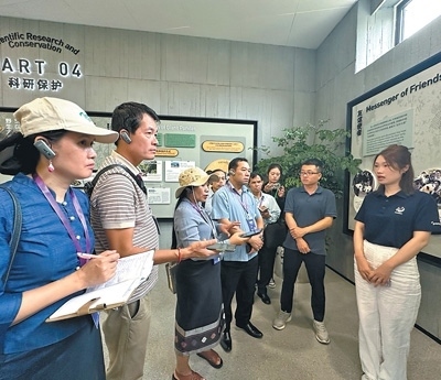 老撾記者在成都大熊貓繁育研究基地對大熊貓保護工作進行采訪。老撾《人民報》記者 薩納尼·蓬帕迪攝