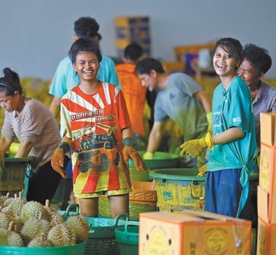 榴蓮是中國第一大水果進口品類。據(jù)統(tǒng)計,2023年中國進口142.6萬噸鮮榴蓮,其中92.9萬噸來自泰國。中國市場的強勁需求,帶動了泰國水果產(chǎn)業(yè)發(fā)展。泰國商業(yè)部數(shù)據(jù)顯示,2024年尖竹汶府的榴蓮產(chǎn)量預(yù)計突破56萬噸,同比增長超4.3%。同時,山竹、龍宮果等熱帶水果的產(chǎn)量也迎來了快速增長。“我推薦了不少親朋好友來水果加工廠上班,收入有保障,旺季的提成更是豐厚!”猜維開心地說。