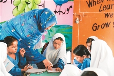 走進干凈整潔的校園,讀書聲、嬉戲聲聲聲入耳,孩童的活力、青春氣息撲面而來。在八年級的課室里,戴著一條寫有“文學比賽冠軍”紅綬帶的女學生薩伊巴·阿斯加爾·阿里成功搶到了回答問題的機會,正在大聲地在全班面前朗誦英語課文。薩伊巴告訴記者,她有7個姐妹,如果沒有這所學校,她可能就沒學上了。
