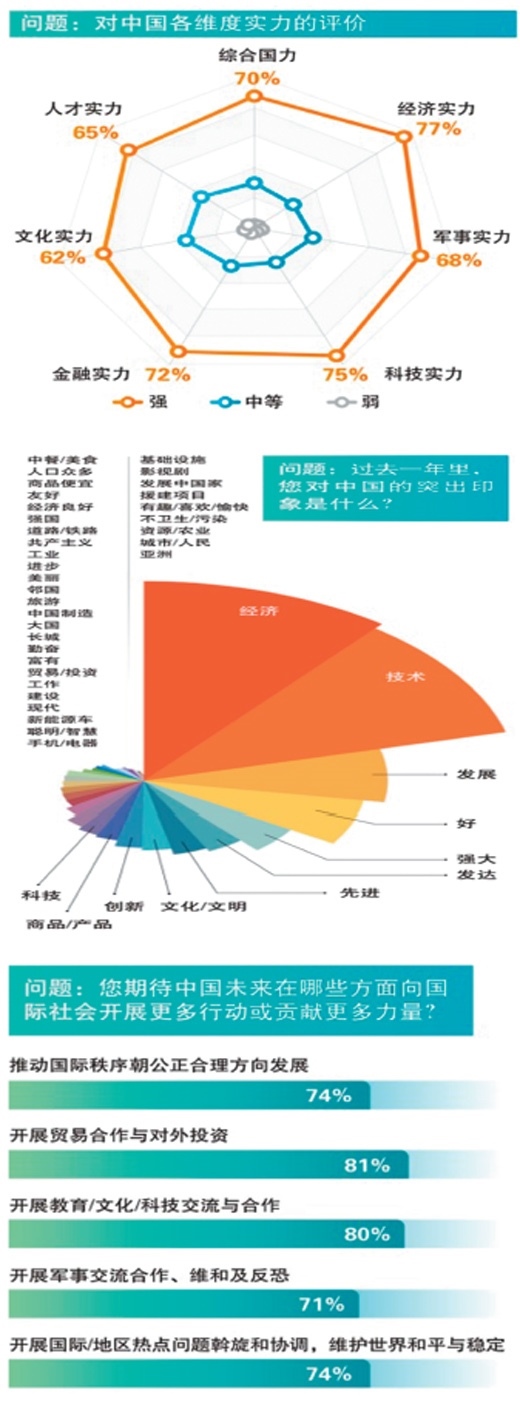 調(diào)查問卷讓被訪者自主描繪其過去一年里對(duì)中國的突出印象。報(bào)告顯示,各國民眾使用率最高的關(guān)鍵詞包括“經(jīng)濟(jì)”“技術(shù)/科技”“發(fā)展/發(fā)達(dá)”“好”“強(qiáng)大/強(qiáng)國”“先進(jìn)/創(chuàng)新”“文化/文明”“商品/產(chǎn)品”“人口眾多”“中餐/美食”等。在發(fā)達(dá)國家、歐洲國家、中東國家和東盟國家,“經(jīng)濟(jì)”被提及的頻次居首;在發(fā)展中國家、非洲國家、金磚國家,“技術(shù)”被提及的頻次最高。