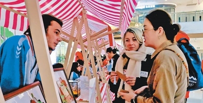 外國游客在北京延慶萬達(dá)廣場(chǎng)體驗(yàn)市集。