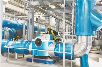 埃及新行政首都中央商務(wù)區(qū)項目能源中心設(shè)置的變頻空調(diào)水泵,為空調(diào)系統(tǒng)循環(huán)提供動力,通過變頻調(diào)節(jié)實現(xiàn)節(jié)省電能的目的。圖為工作人員對水泵進行檢查和維護。