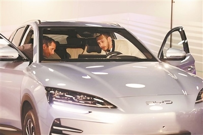 在匈牙利首都布達佩斯舉行的比亞迪某新款新能源汽車發(fā)布會上,嘉賓在了解車輛性能。