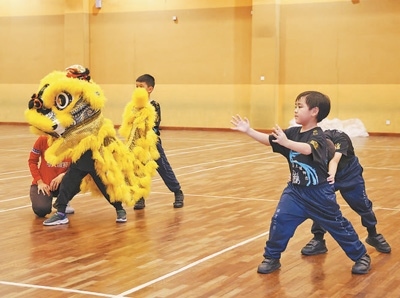 馬來西亞雪蘭莪州培才二校的學(xué)生在練習(xí)舞獅。