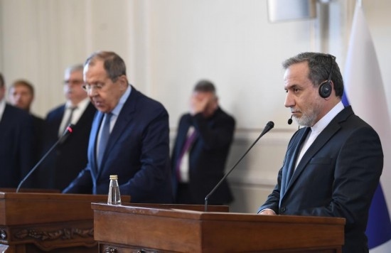 2025年2月25日,在伊朗德黑蘭,伊朗外交部長阿拉格齊(右)與俄羅斯外長拉夫羅夫出席聯(lián)合新聞發(fā)布會。新華社記者沙達提攝