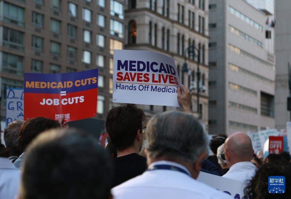 5月1日,人們手持標語在美國紐約參加抗議特朗普政府政策的集會和游行。新華社發(fā)(郭克攝)
