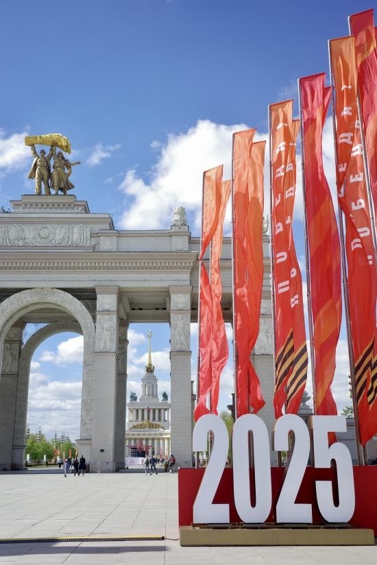 當(dāng)?shù)貢r間5月6日,莫斯科威登漢(國民經(jīng)濟成就展覽館)大門前一側(cè),布置好了2025標(biāo)志和紀念旗幟。劉少華 攝