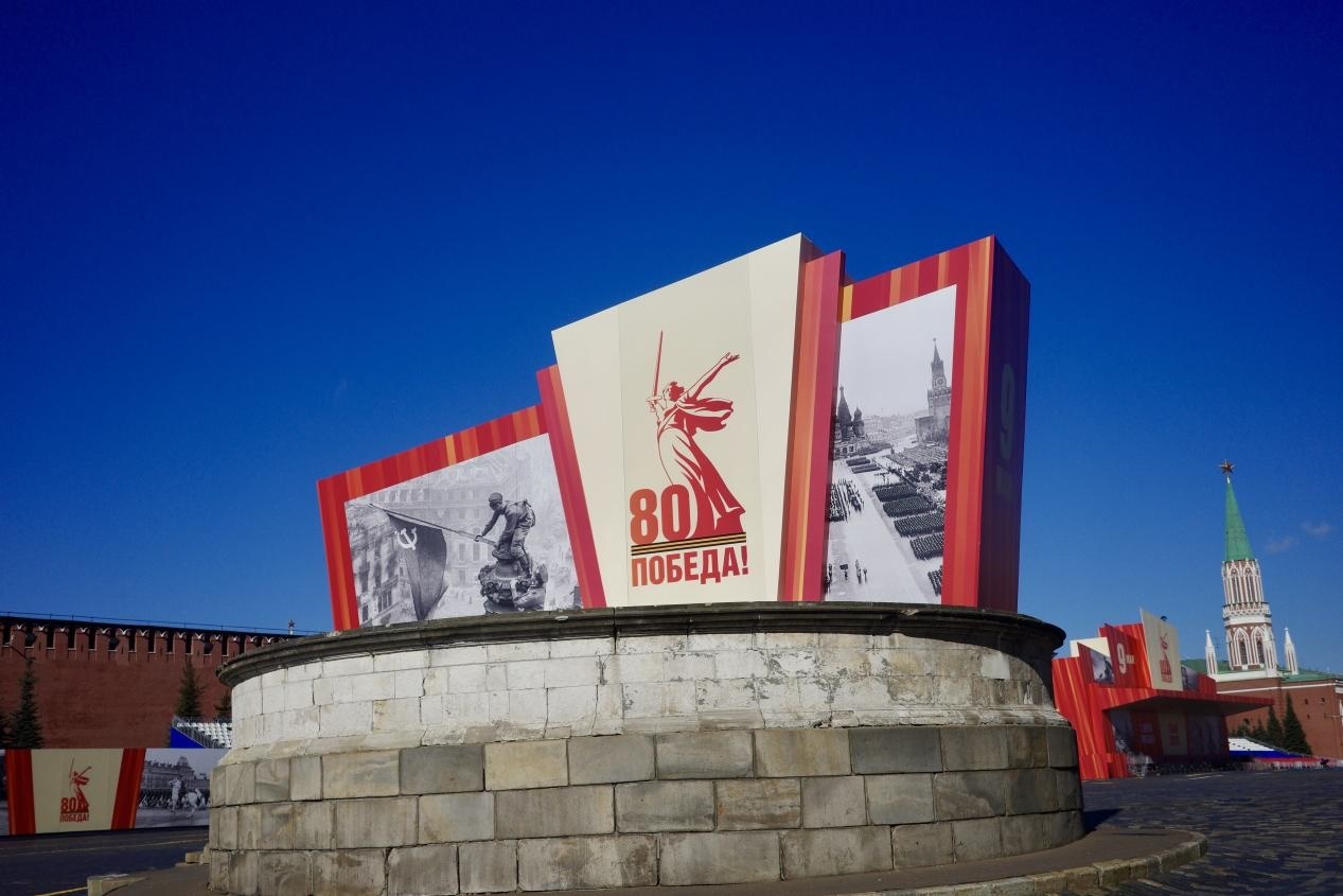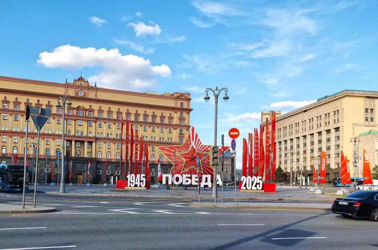 當(dāng)?shù)貢r間5月6日,莫斯科盧比揚卡廣場布置紀念蘇聯(lián)偉大衛(wèi)國戰(zhàn)爭勝利80周年的標(biāo)語。鄺西曦 攝