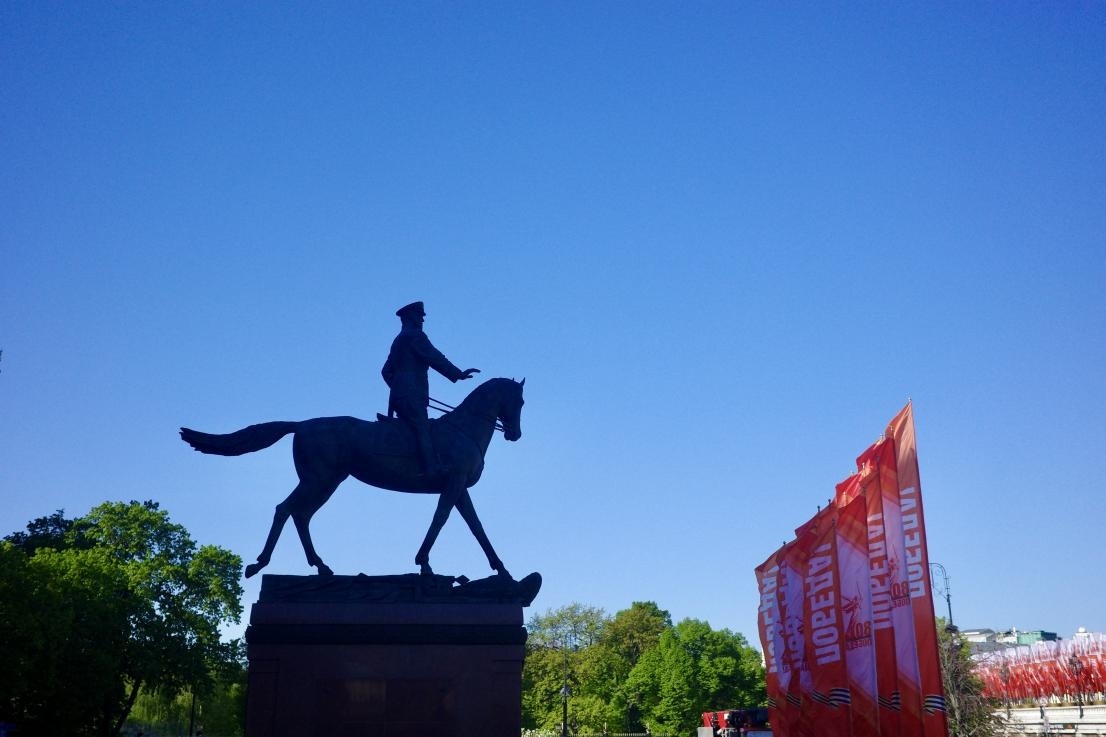 當(dāng)?shù)貢r間5月6日,朱可夫元帥雕塑。這一形象原型來自1945年的勝利日閱兵,當(dāng)時朱可夫騎馬行進在紅場。 劉少華 攝