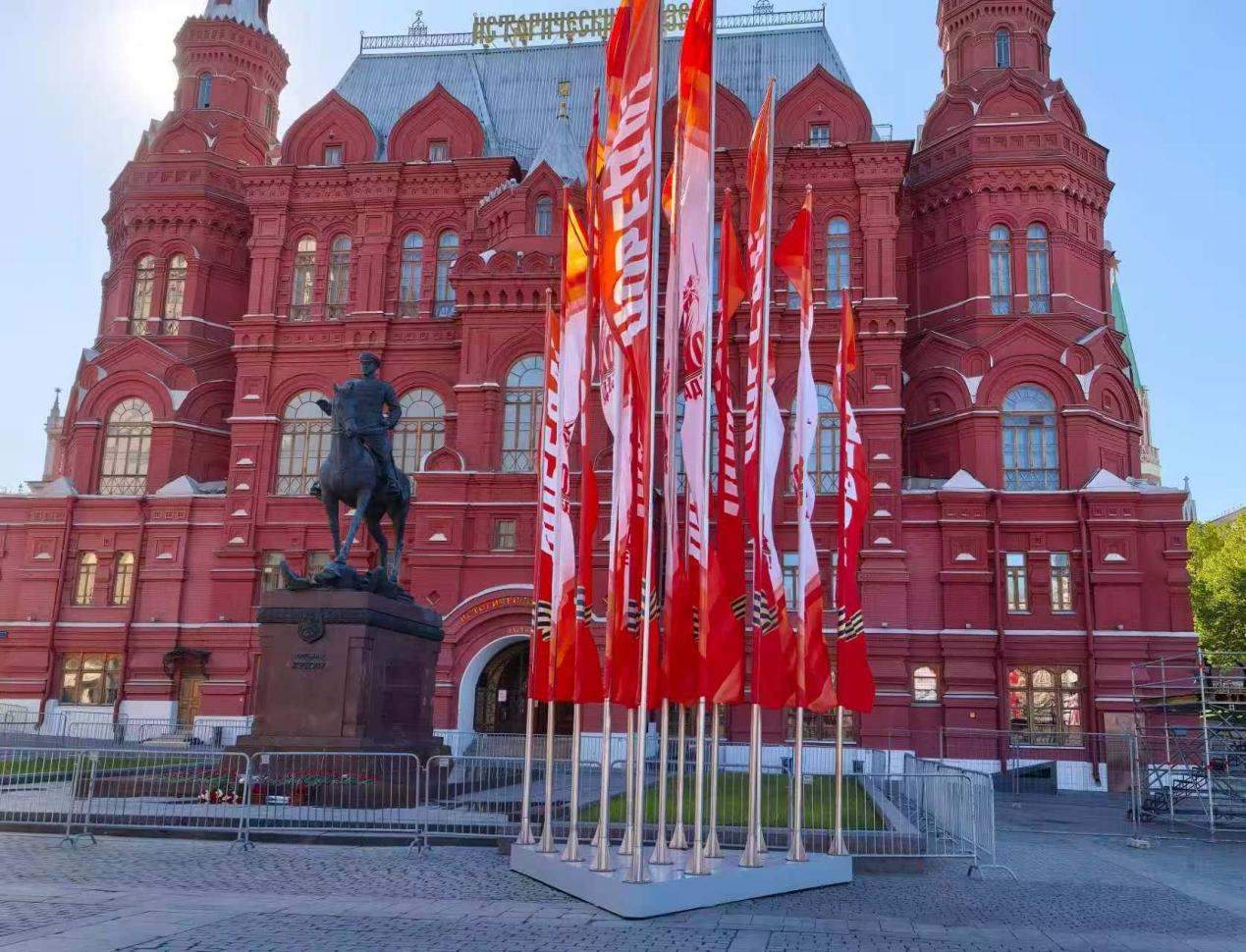 當(dāng)?shù)貢r間5月6日,俄羅斯國家歷史博物館前擺放紀念蘇聯(lián)偉大衛(wèi)國戰(zhàn)爭勝利80周年慶典旗幟。 鄺西曦 攝
