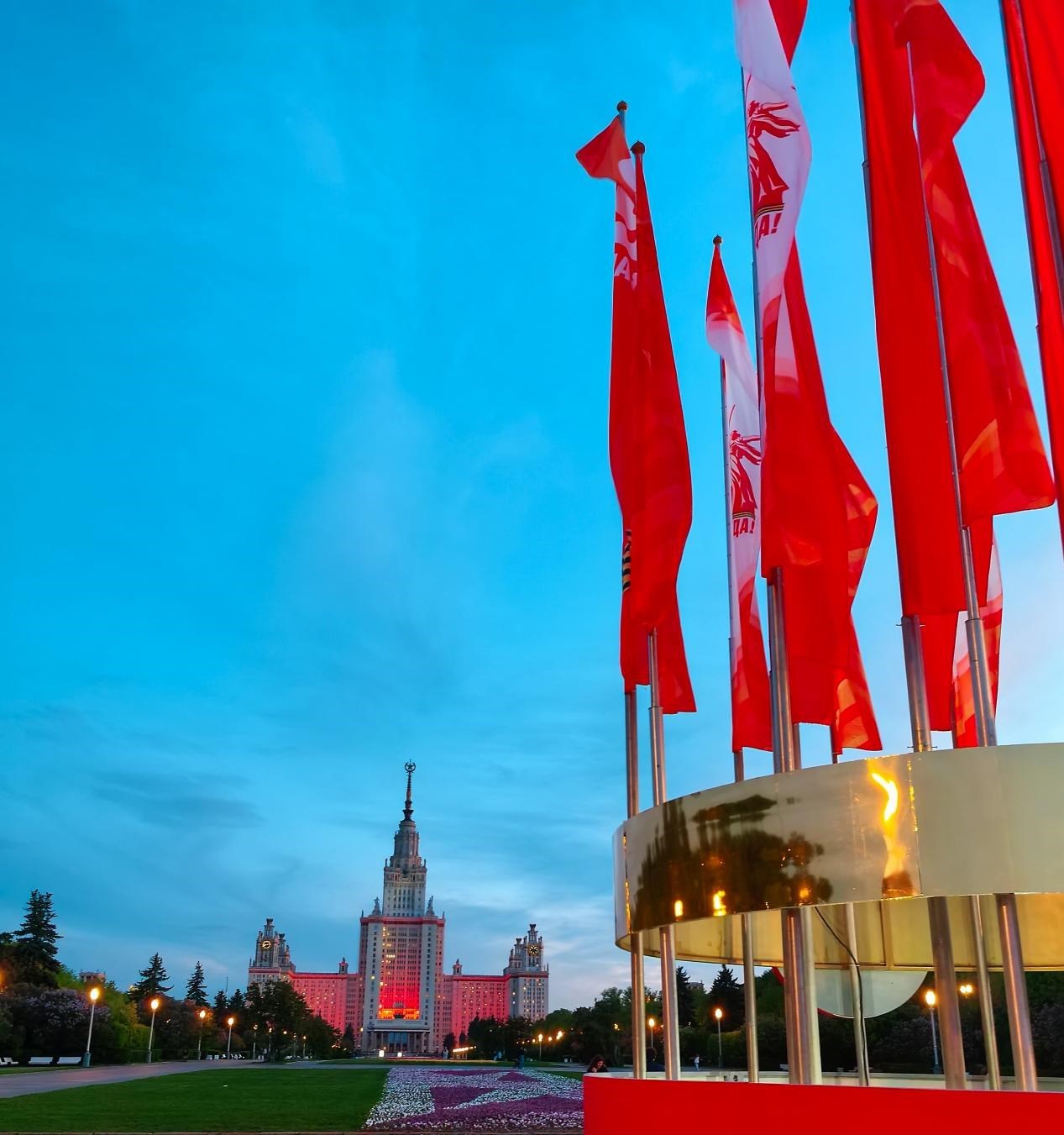當(dāng)?shù)貢r間5月6日,莫斯科麻雀山,紀念蘇聯(lián)偉大衛(wèi)國戰(zhàn)爭勝利80周年慶典的旗幟飄揚,與莫斯科國立大學(xué)主樓的燈火遙相輝映。 鄺西曦 攝