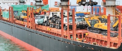 近日,在山東港口煙臺(tái)港蓬萊港區(qū),出口圭亞那和蘇里南的國產(chǎn)卡車被裝入拉美航線貨輪。
